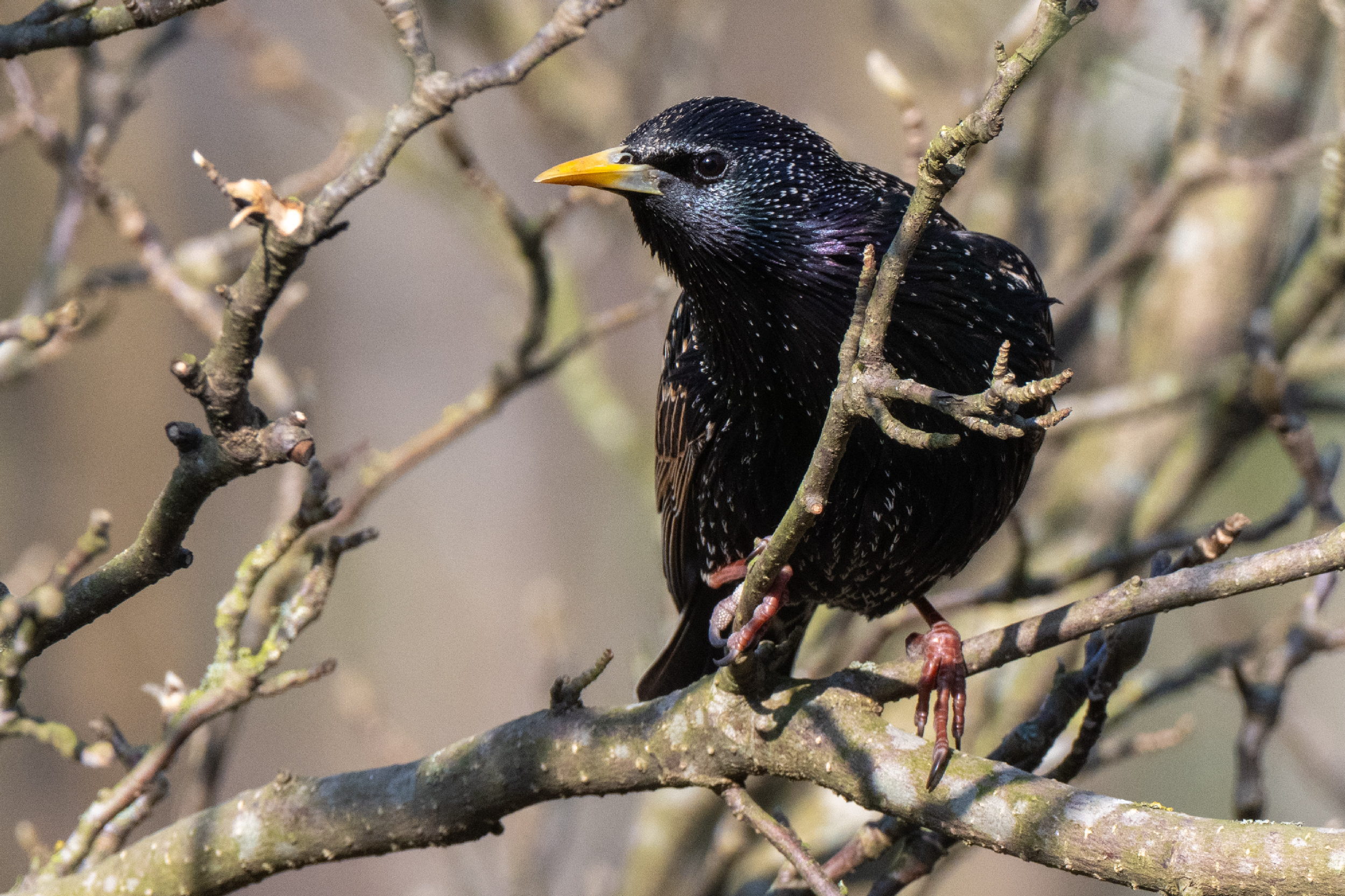 Ein Star im Kirschlorbeer bei weniger als 1 m von der Fensterscheibe. An den Futterstellen werden die Vögel lediglich angelockt. Fotografiert werden sie auf den Zweigen nah benachbarter Sträucher, die sie als Anflugorte zum checken des Umfeldes der Futterstelle nutzen. Die eingesetzten technischen Voraussetzungen werden auf den Fotos nicht sichtbar. Außer einer Kamera benötigt man ein starkes Telezoomobjektiv je nach dem, wie weit das Motiv entfernt ist. Ein Blitzgerät kann man beim Fotografieren aus Innenräumen wegen der Fensterscheibe nicht benutzen. Wird die Kamera auf einem Stativ im Außenbereich eingesetzt, muss man beim Fotografieren von Innen einen Fernauslöser benutzen. Hier nun einige Beispielfotos:
