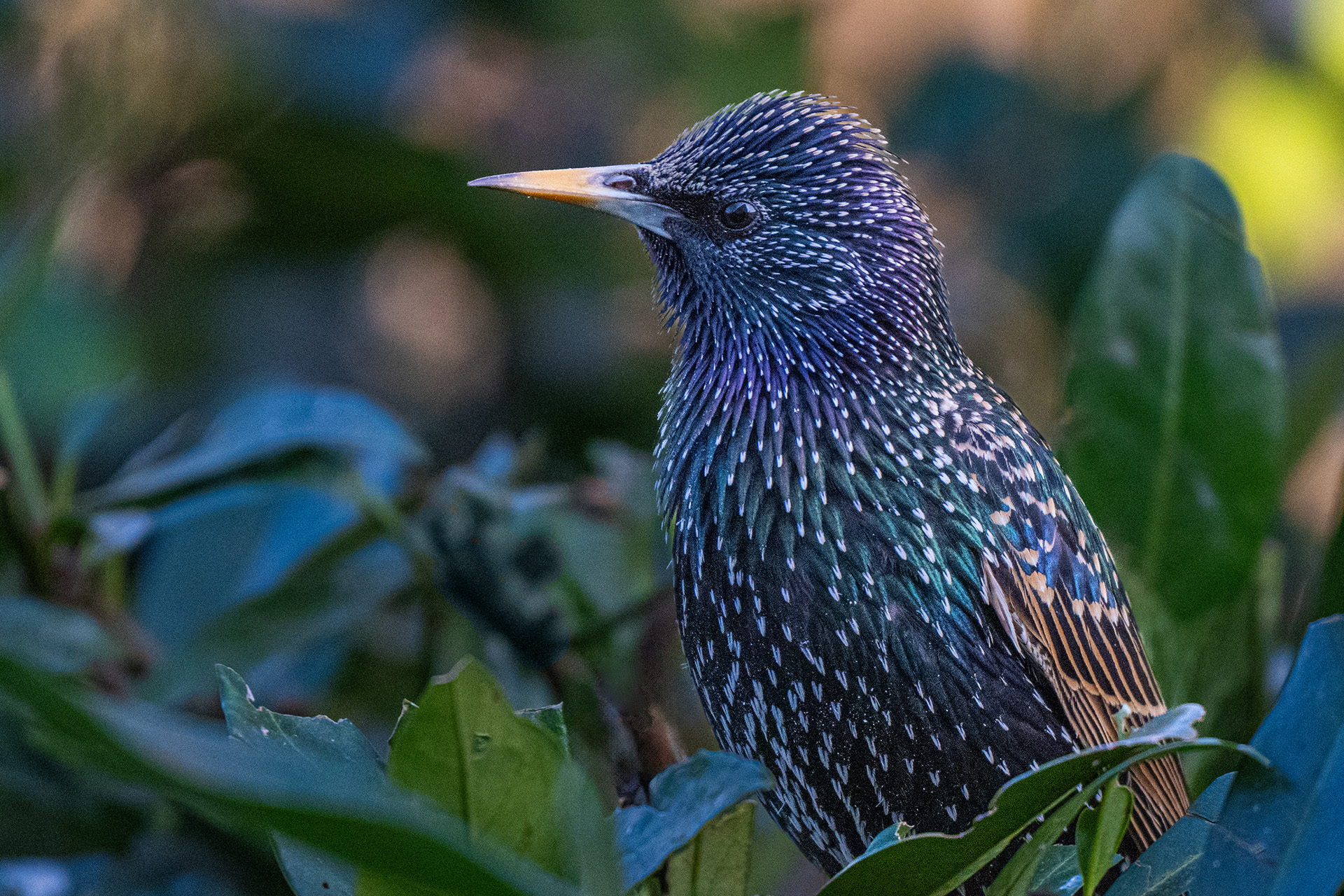 Ein Star im Kirschlorbeer bei weniger als 1 m von der Fensterscheibe. An den Futterstellen werden die Vögel lediglich angelockt. Fotografiert werden sie auf den Zweigen nah benachbarter Sträucher, die sie als Anflugorte zum checken des Umfeldes der Futterstelle nutzen. Die eingesetzten technischen Voraussetzungen werden auf den Fotos nicht sichtbar. Außer einer Kamera benötigt man ein starkes Telezoomobjektiv je nach dem, wie weit das Motiv entfernt ist. Ein Blitzgerät kann man beim Fotografieren aus Innenräumen wegen der Fensterscheibe nicht benutzen. Wird die Kamera auf einem Stativ im Außenbereich eingesetzt, muss man beim Fotografieren von Innen einen Fernauslöser benutzen. Hier nun einige Beispielfotos: